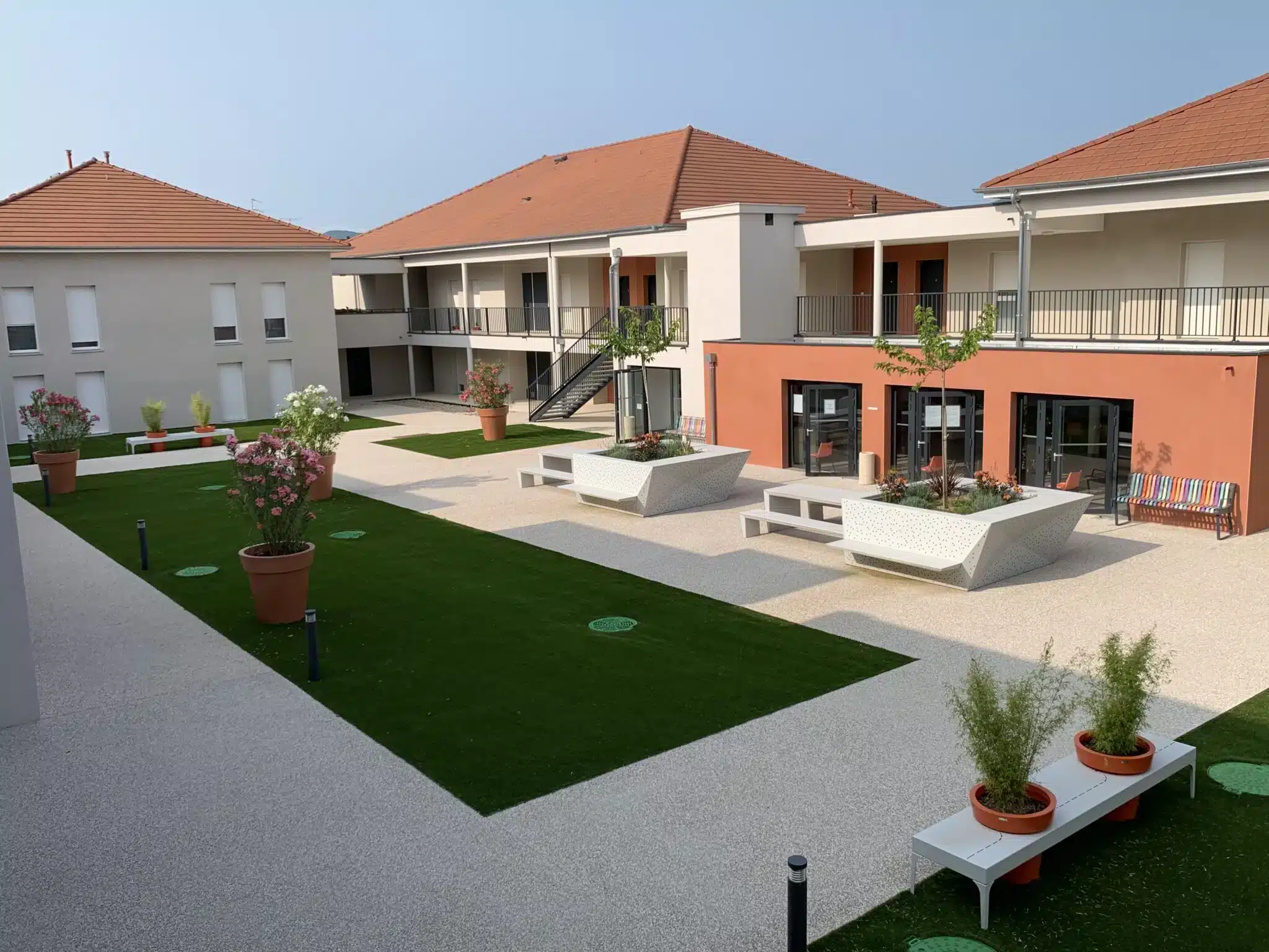 Idée pour aménager et végétaliser la cour d’une résidence pour personnes âgées avec l’expertise d’ATECH SAS. Découvrez nos idées !